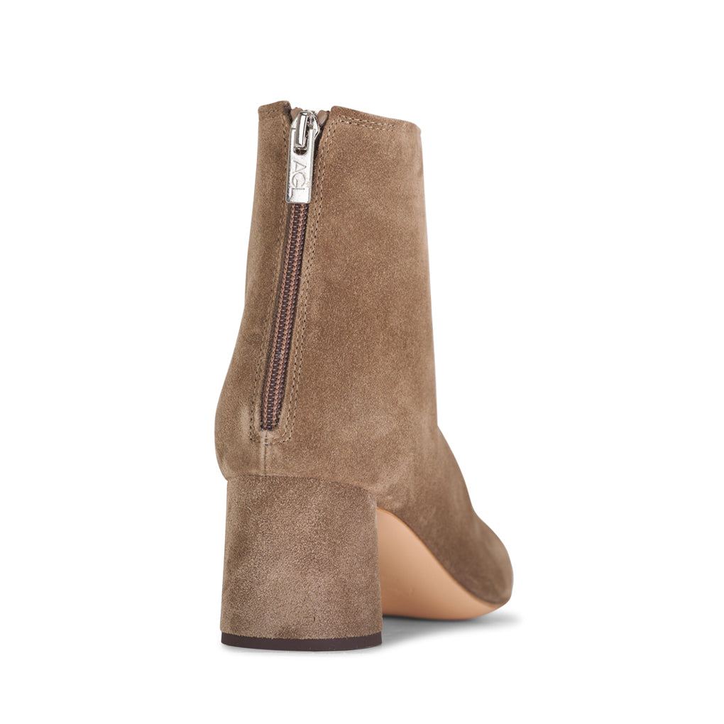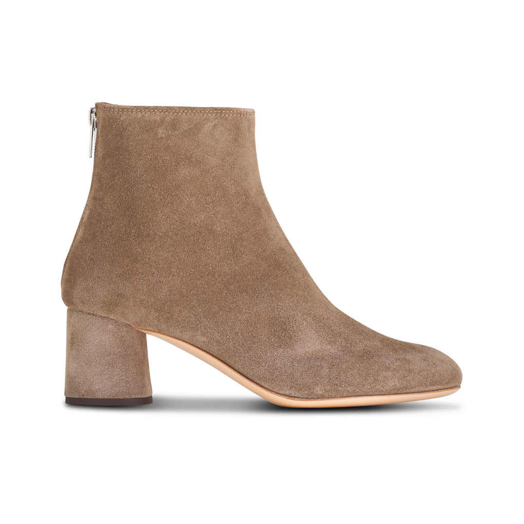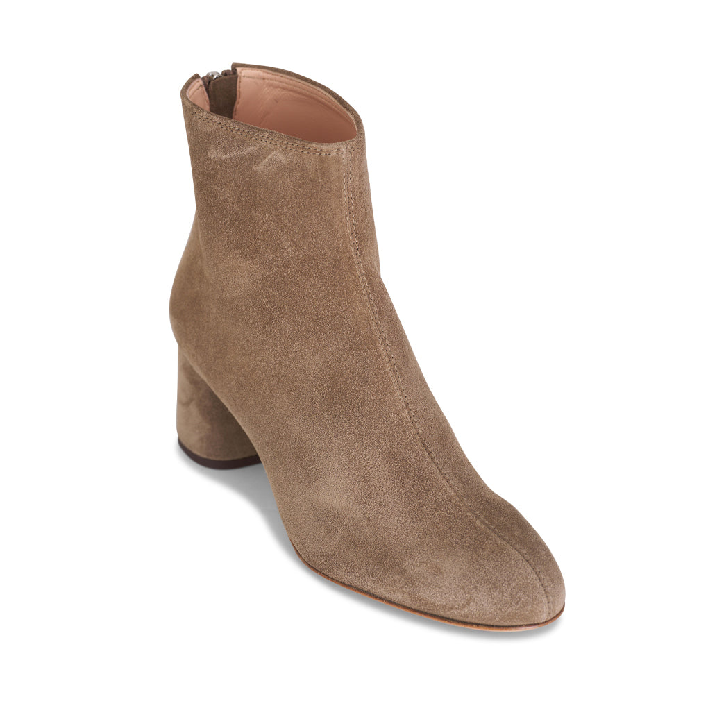 Minimalistic design for a low boot made entirely of velour, covering even the original, elegant cylindrical heel. A timeless creation in a color that goes with everything.